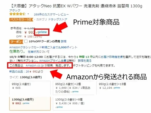 商品に「✓prime」のマークが付いている商品と、Amazonから発送される商品が対象です。
