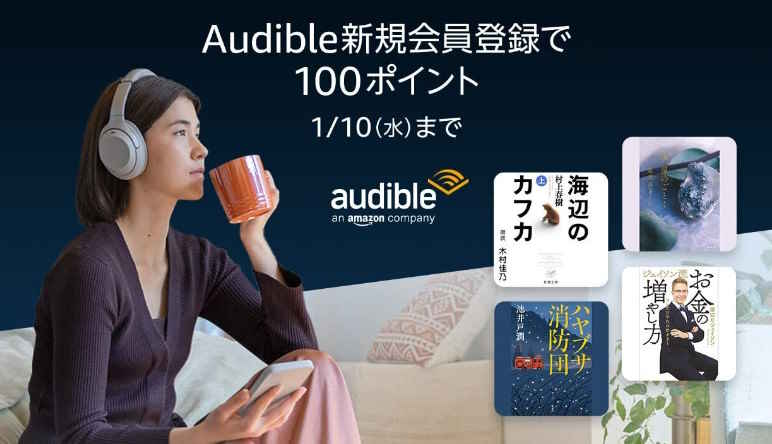期間中、Audible(オーディブル)に登録すると30日間無料+100ポイントで登録できます。