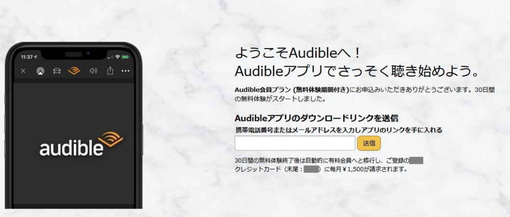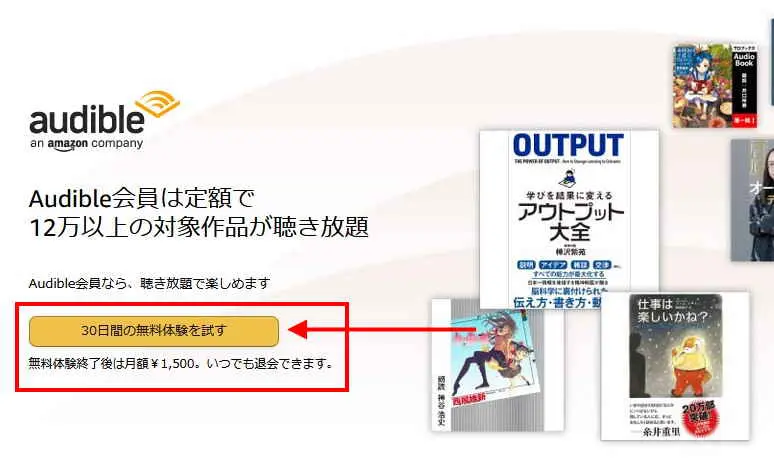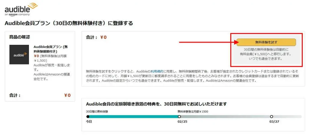 - Audible登録ページで「30日間の無料体験を試す」をタップ