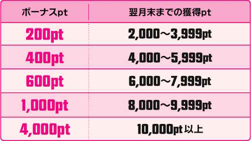 条件は、新規登録後の翌々月末までの獲得ポイントに応じて最大4,000pt(2,000円相当)がもらえます。