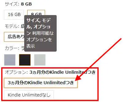 Kindle端末(キッズモデルを除く)の商品ページで「3ヶ月分のKindle Unlimitedつき」を選択して購入すると、Kindle Unlimitedを3ヶ月無料で体験することができます。