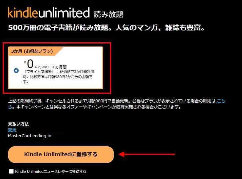 Kindle Unlimitedのキャンペーンプランに登録した時点で料金が請求されます。