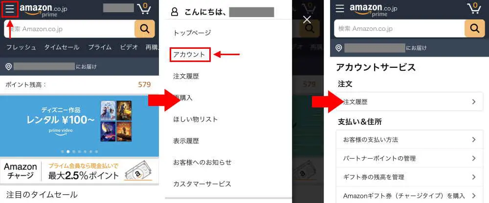 ブラウザでAmazonにサインインし、メニューから「アカウント」をタップし「アカウントサービス」へ進んでください。