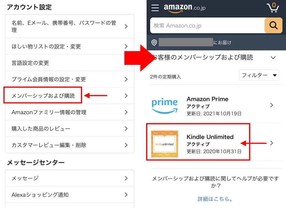 「メンバーシップ及び購読」へ進み「Kindle Unlimited」を選択