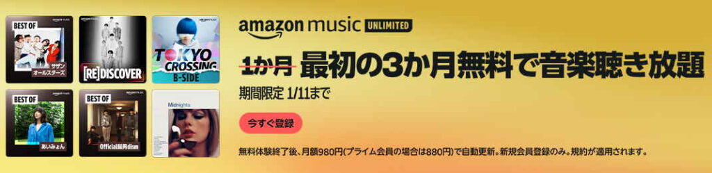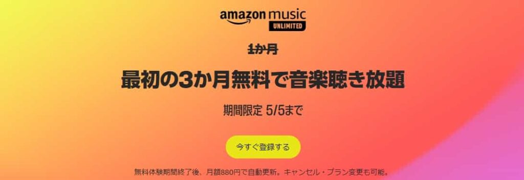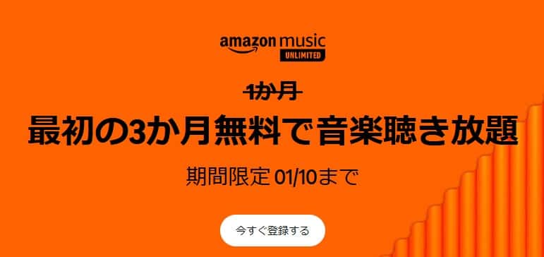 | キャンペーン内容 | Music Unlimitedが5か月間無料 (プライム会員以外は3か月無料) |