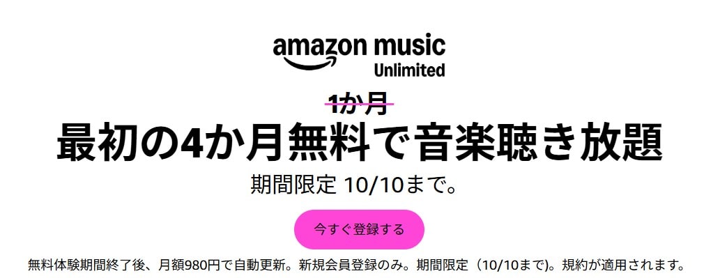 【10/10まで】Music Unlimited 4か月無料キャンペーン
