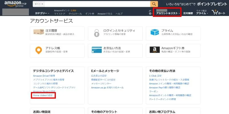 Amazonにログイン後、「アカウント&リスト」→「Prime Videoの設定」の順に進んでください。