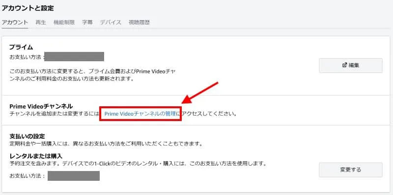 Prime Videoの設定画面で「Prime Videoチャンネルの管理」をクリックしてください。