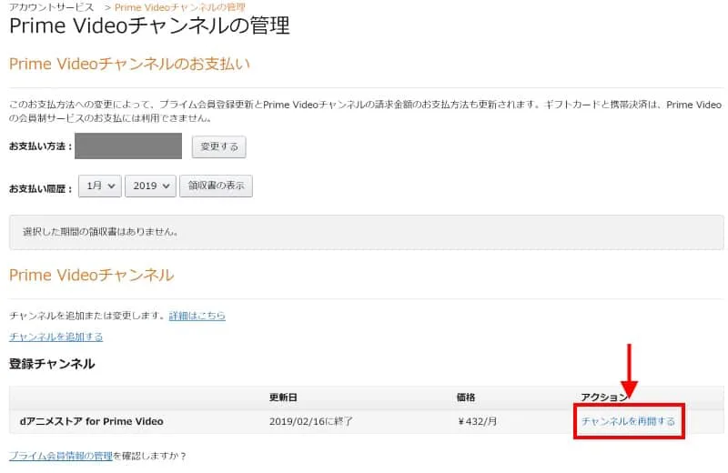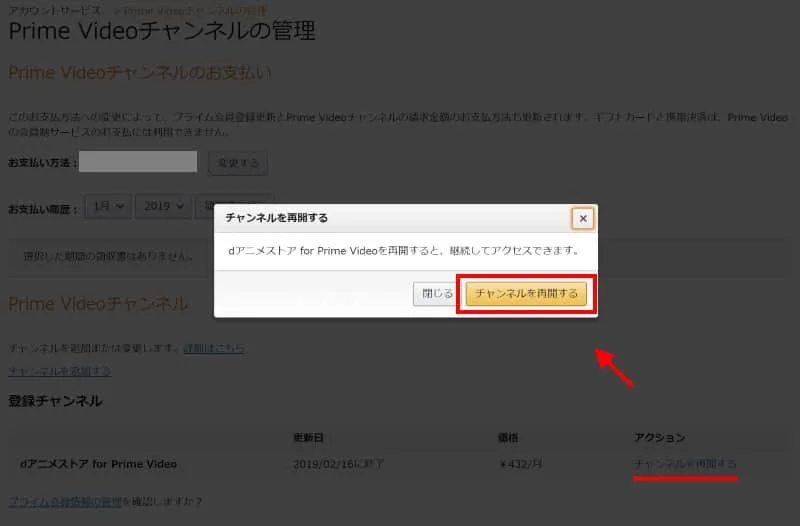 解約したチャンネルの右端に表示される、チャンネルを再開するをクリックすることで再登録をすることが可能です。